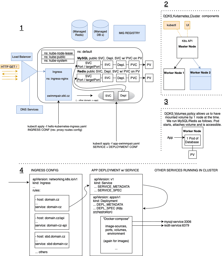 MySQL&Redisdatabases in cluster and one PHP app utilizing it. Orange color is used for external communication/traffic. - Running cluster architecture - 1 DOKS (Master) & 2 Nodes (2nd+ nodes are optional - therefore blue).