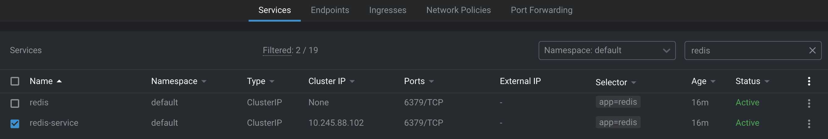 service/redis-service created Result in Lens